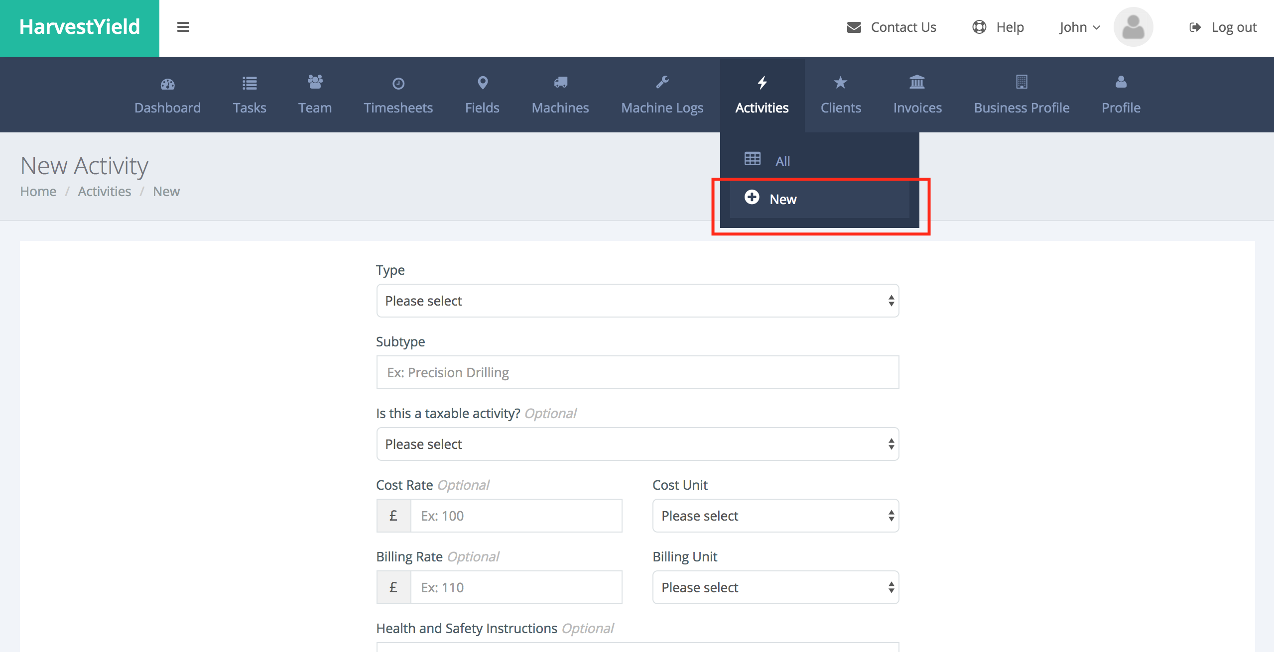 HarvestYield organizes your work using activities and jobs.