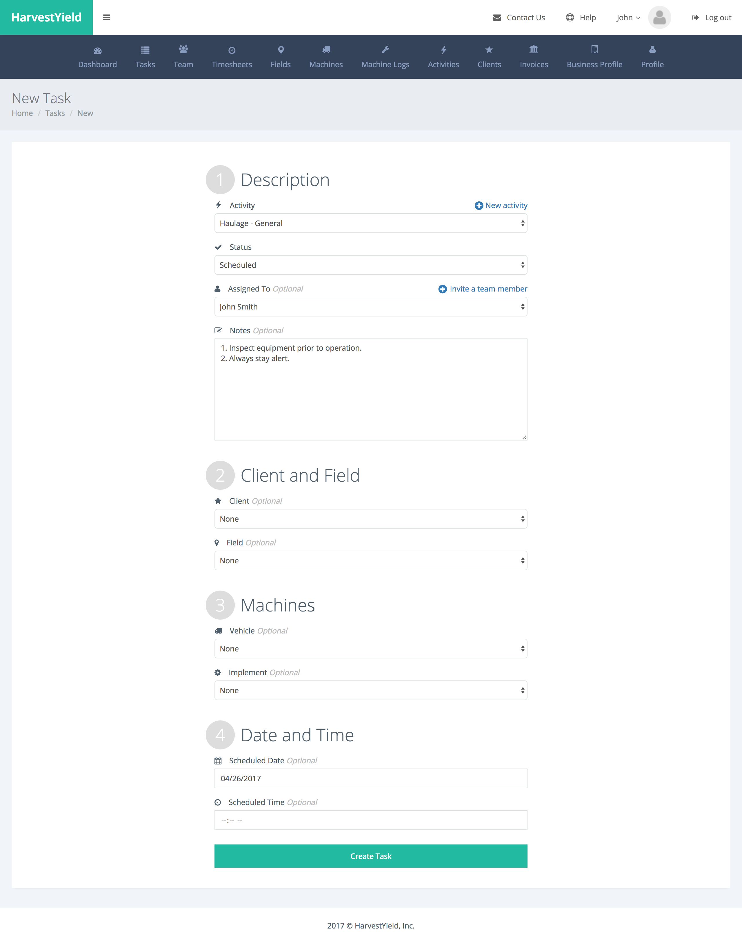 For now, we won't select a Client, Field or Machines, we can add those later on.